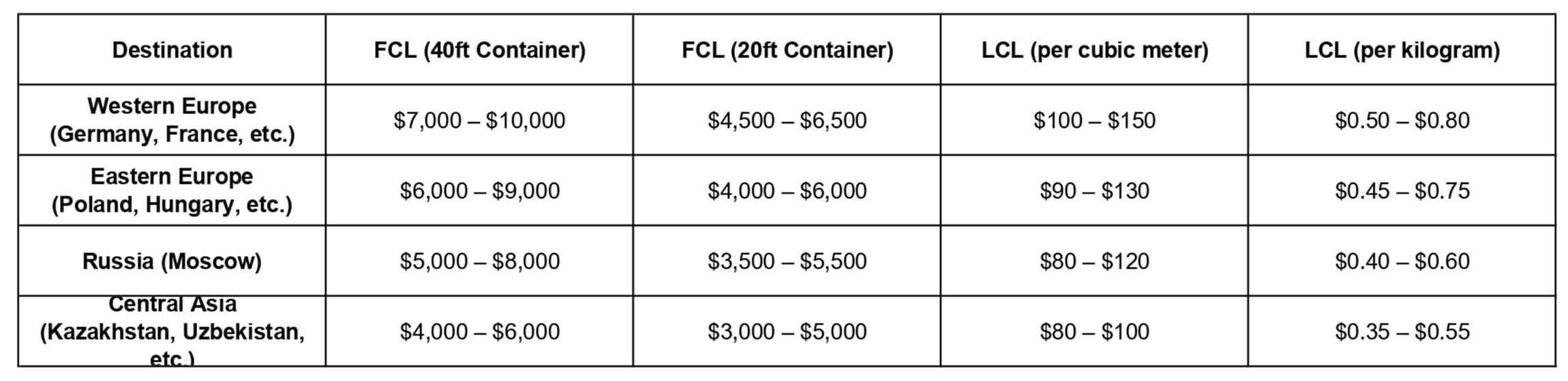 - FCL: Shipping to countries like Kazakhstan and Uzbekistan typically costs between $4,000 and $6,000.