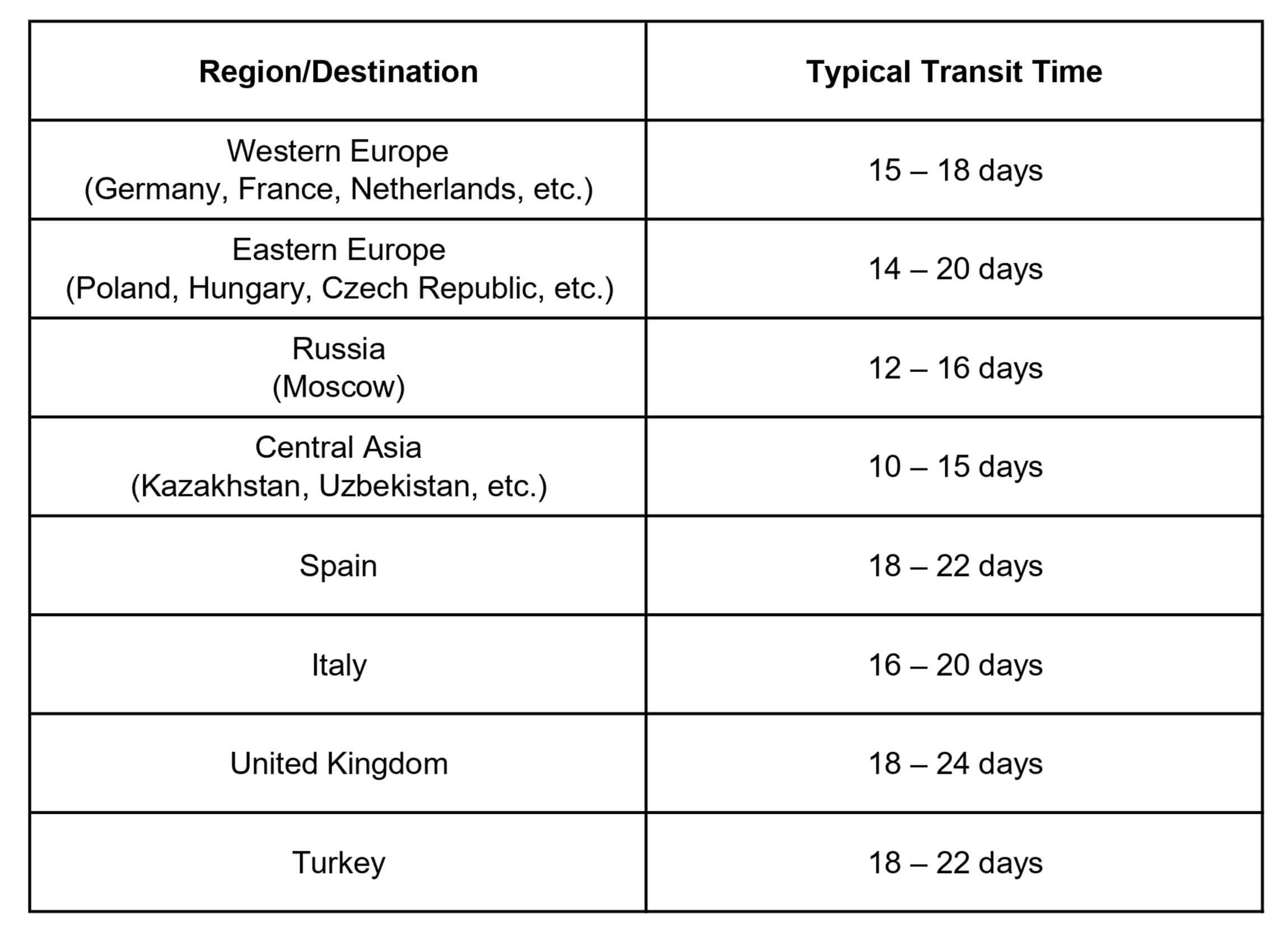 This route connects China to Russia and Northern Europe. The average shipping time is between 12-20 days for most countries along this path.